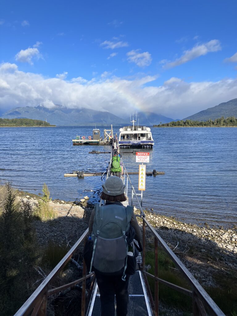 そんな話をしながら到着したテアナウ・ダウンズは、私は何度目でしょうか。見慣れた光景ですが、先輩は「本当に何にもないね!」と。ボートに乗り込んでいざ出発、虹も出迎えてくれました。
