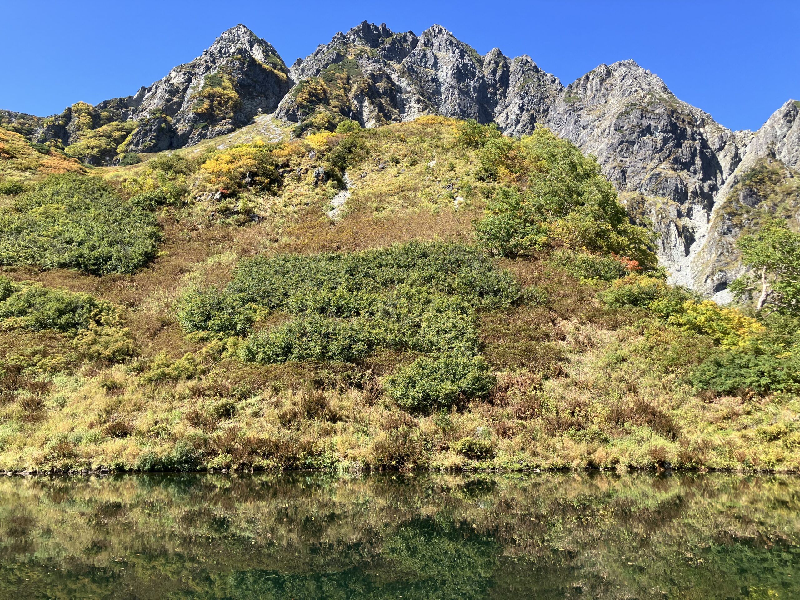 常念山脈がパキっと見えたのも嬉しかった。あの稜線をついこの前歩いたんだな、今まで何度も歩いたんだなと、5分10分、どれだけ見ても飽きずに眺める。奥又白池の絵を描くなら、この角度だろう。今回スケッチブックとペンを持ってこなかったのが悔やまれる。