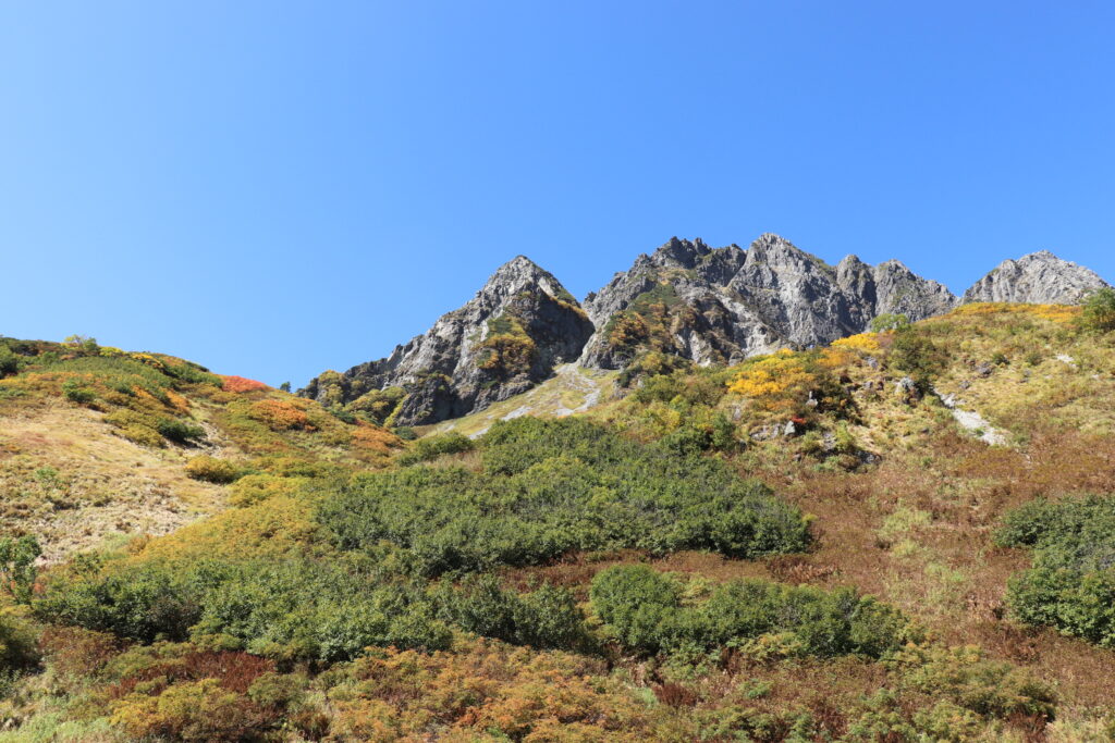 何度か視界が開けたり、藪の中に入ったりをを繰り返していくうちに、標高はあっという間に2000mを超え、蝶ヶ岳が同じ目線の高さに見えるようになってくる。そして小屋からは見えない常念岳も角度的に見えるようになってくる。つくづく思うが、常念岳は遠くから見ても近くから見てもかっこいい。今まで歩いてきた山それぞれに思い出や思い入れはあるが、常念岳は特別な山のうちの一つ。恐怖心と闘いながらの山歩き中、そんな常念岳が見えると、ほっと安心する。