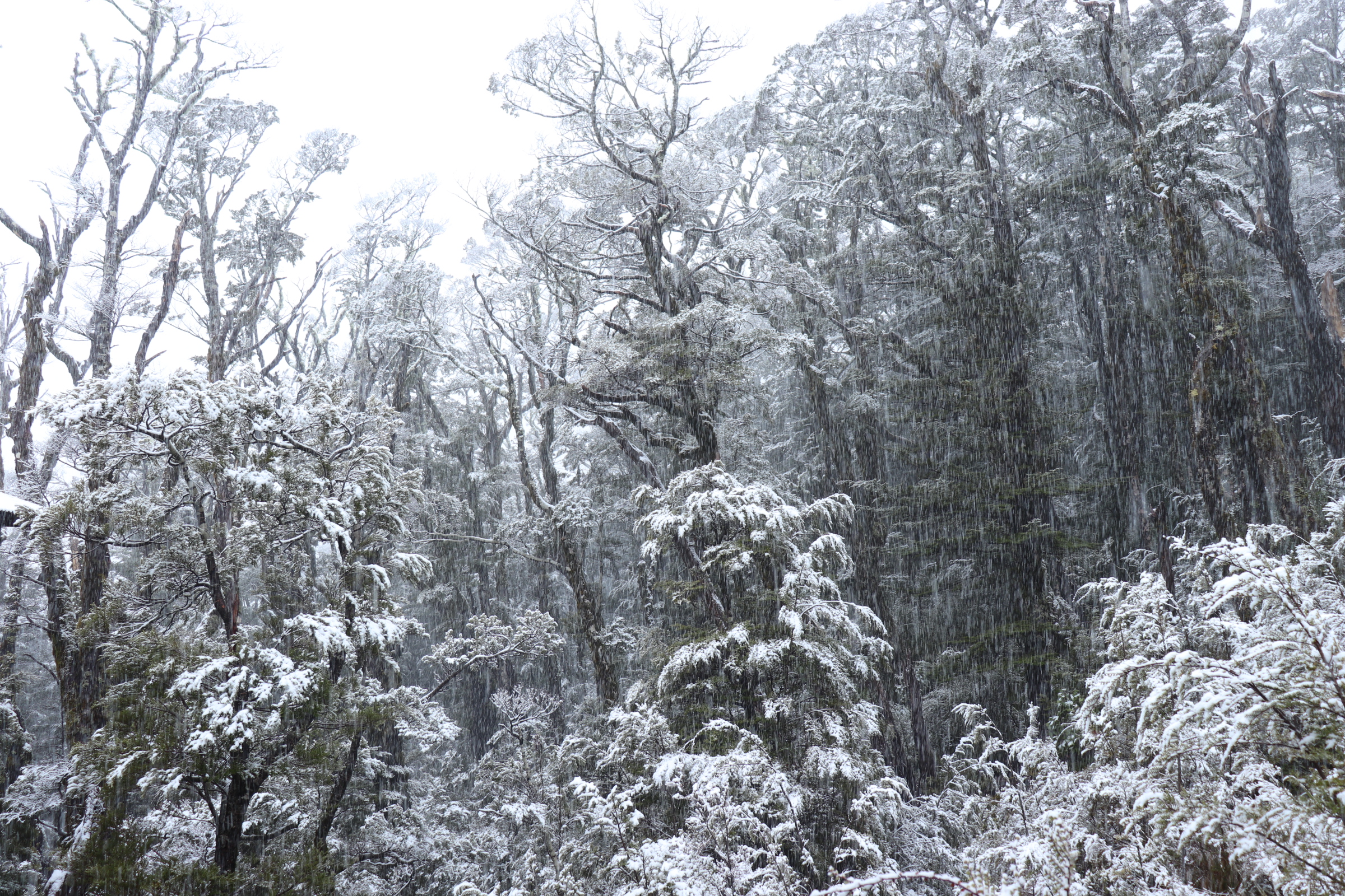 お天気は回復せず、クリスマスソングが聞こえてくるような、真っ白雪に纏われた木々、山肌の岩々。昨日の時点で、今日の天気はさらに悪いと聞いていたので、何となく予感はしていましたが、案の定お昼頃にF小屋のマネージャーからアナウンスがあります。「M小屋のスタッフ、今日はヘリは飛ばないから、もうF小屋にもう一泊!」
