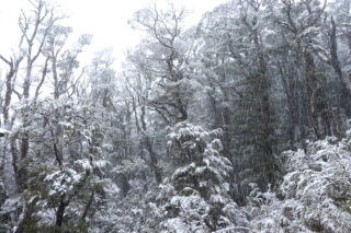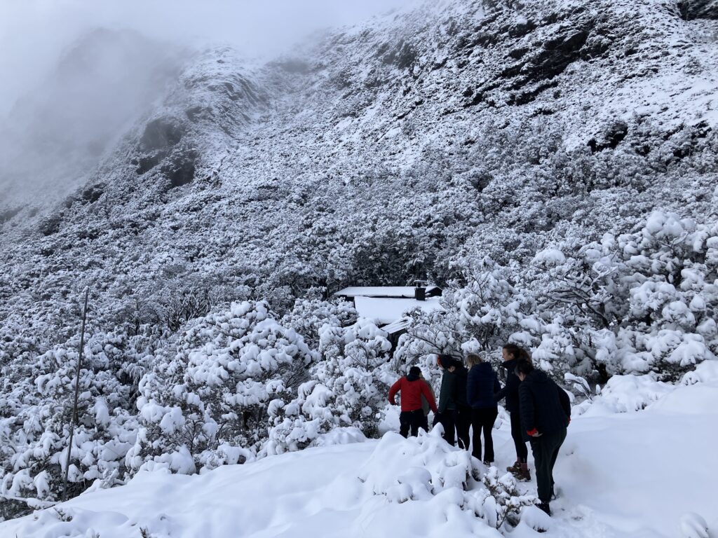 3日目、朝8:00にはラウンジ集合ということで8:00前、寒い寒いと独り言を言いながら、ラウンジへ向かいます。外は昨晩から続いた雪で真っ白、定規で測ると18cm。集合して何かしらするのかと思えば、8:00過ぎてからラウンジに現れる人がいるのはもちろん、朝ご飯を作り始める人もいます(食べ始めるではなく、作り始める)。何かが始まる気配はなく、私とブリッジは小屋から数十秒歩けば滝が見えるので、たくさん着込み手にはテムレスをつけて外の空気を吸いに行くことに。小屋に戻っても状況は変わっておらず、9:00前、F小屋のマネージャーがヘリパッドで集合写真を撮ろうと声をかけます。