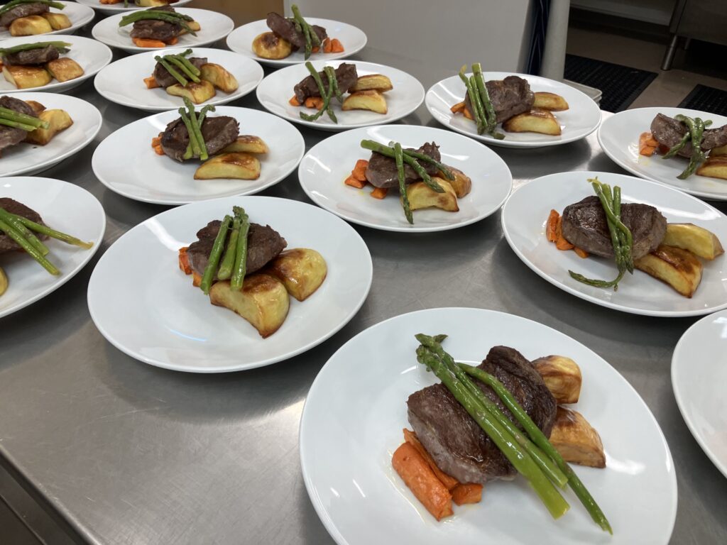 ▲メインメニューの一つ、ステーキはフライヤーで表面に焼き目をつけてオーブンで焼きます。ミディアムレア、55度