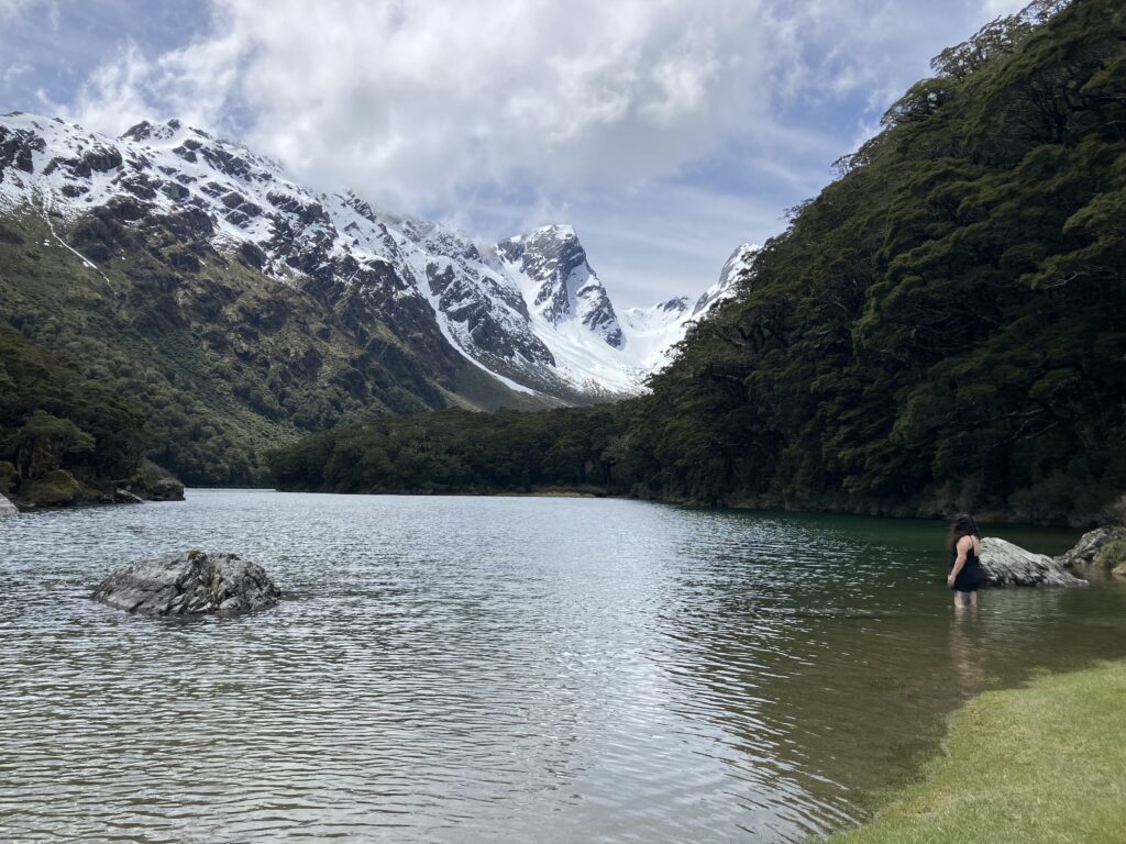 ▲ブリッジとM小屋から歩いて1、2分のM湖。長袖を着込む寒さ、水は氷のように冷たいのに、キウイ(ニュージーランド人)はスイスイっと水に入っていきます