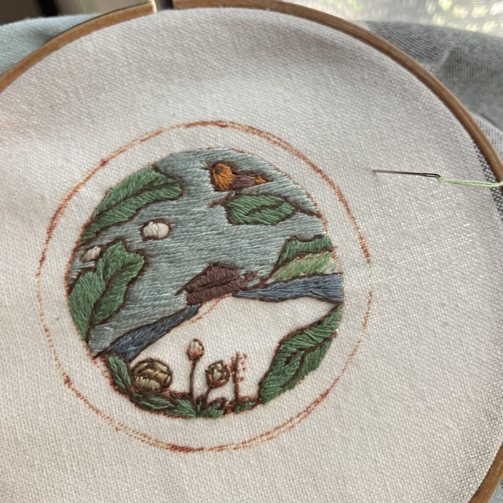 こちらの刺繍は数日で完成。全て1本どりで刺してみました。自分の絵を刺繍するのは、本やDMCサイトのお手本を刺繍するのとはまた違います。絵を描くこと、刺繍することが延長線上にあるようで、迷いなくするすると刺すことができました。気持ち的にも楽。本やサイトの図案は自分ではない誰かが描いたものなので、無意識に、この線は?とかこの部分は?とかこの色は?と絵を頭で理解しようとしたり分析してしまっているのかもしれません。