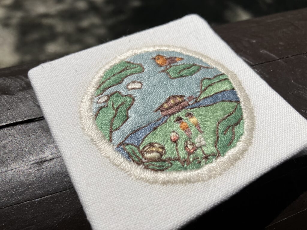 山小屋の売店で販売する手拭いの制作をし、納品も終わって・・・次に舞い込んできたのは「山小屋のオリジナルバッジ、デザインしてよ!」と、バッジのお話。私が作っていいんですか!と言うことで、山小屋の勤務中や休み時間にちまちまとデザインを考える日々。なんとなくデザインは決めたものの、細かな部分をどうしようどうしようとぐるぐる考えてしまうので、一旦刺繍にして考えよう!とよくわからない発想に辿り着きました。iPad上で絵を描くよりも糸で表現してみたら何かアイディアが生まれるんじゃないでしょうか?