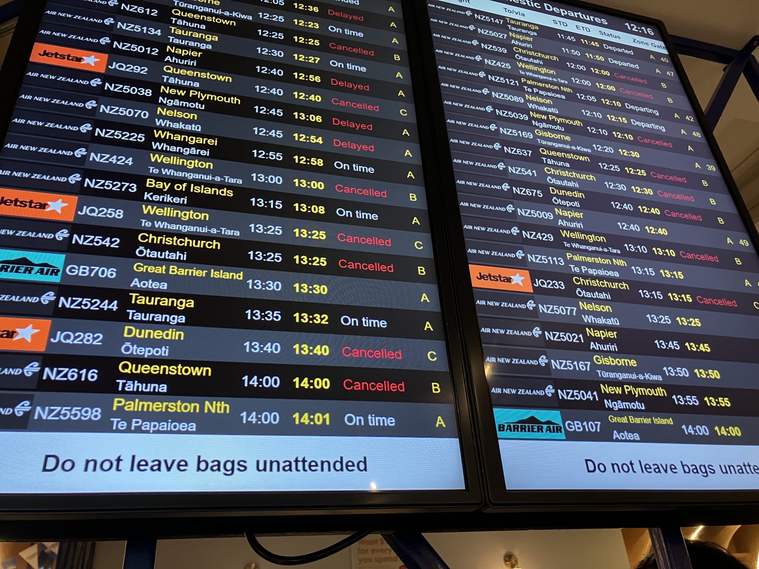 ニュージーランドに到着してからはオークランドで乗り換え。しかしここで問題発生。ニュージーランド全体で天気がよろしくなく、多くの便が欠航もしくは遅延。私が飛ぶ時間前後にも欠航のお知らせが出ています。え、もしかして、今日オークランドに泊まらないと行けないかも?