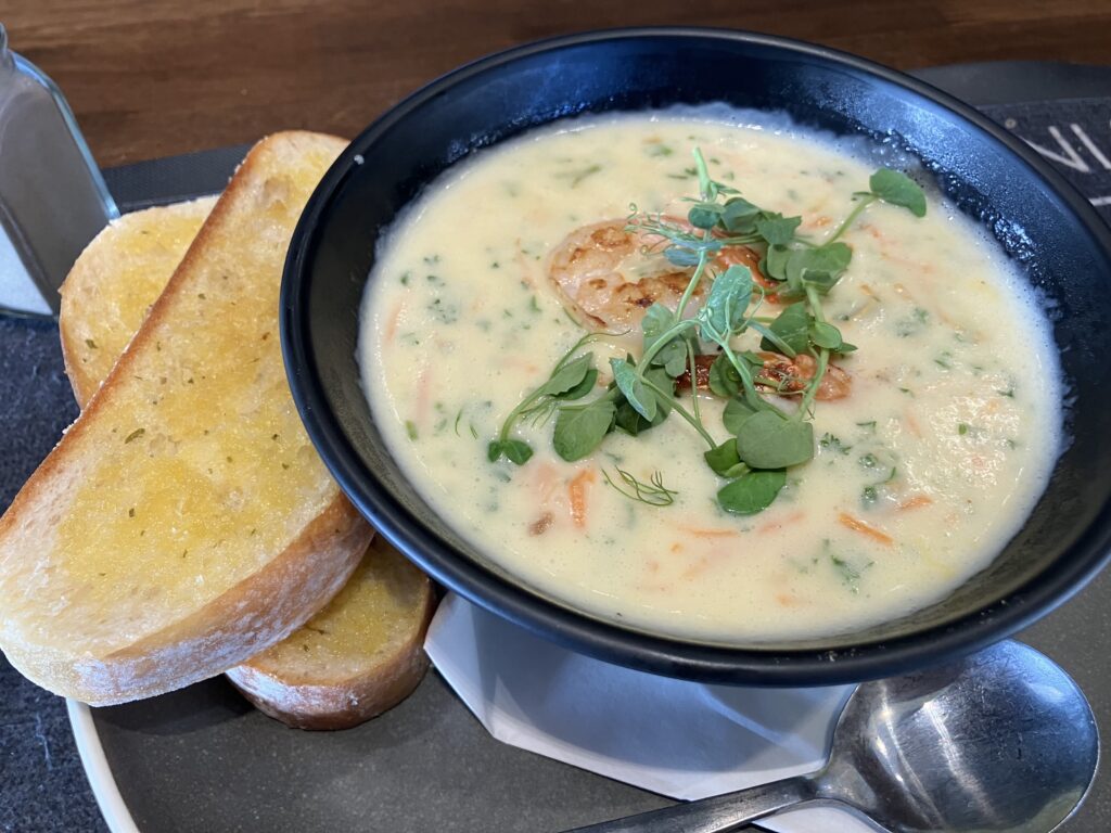 チェックインをした後は荷解きをし、少し休んで夜はレストランへ。レストランというよりバーのような雰囲気。1人で座ってる人なんていませんが、私はニュージーランドでソワソワせず1人で食事をするということが最近できるようになりました(何自慢)。バーの真ん中に堂々と座り1人でポツンとクラムチャウダーにジンジャービールをいただきます。運んできてくれたお兄さんがとても素敵な笑顔だったこと、忘れられません。クラムチャウダーもサーモン、イカ、貝類と具がゴロゴロと入っておりとっても美味しくいただきました。あまり期待したなかったので(笑)嬉しいサプライズです。