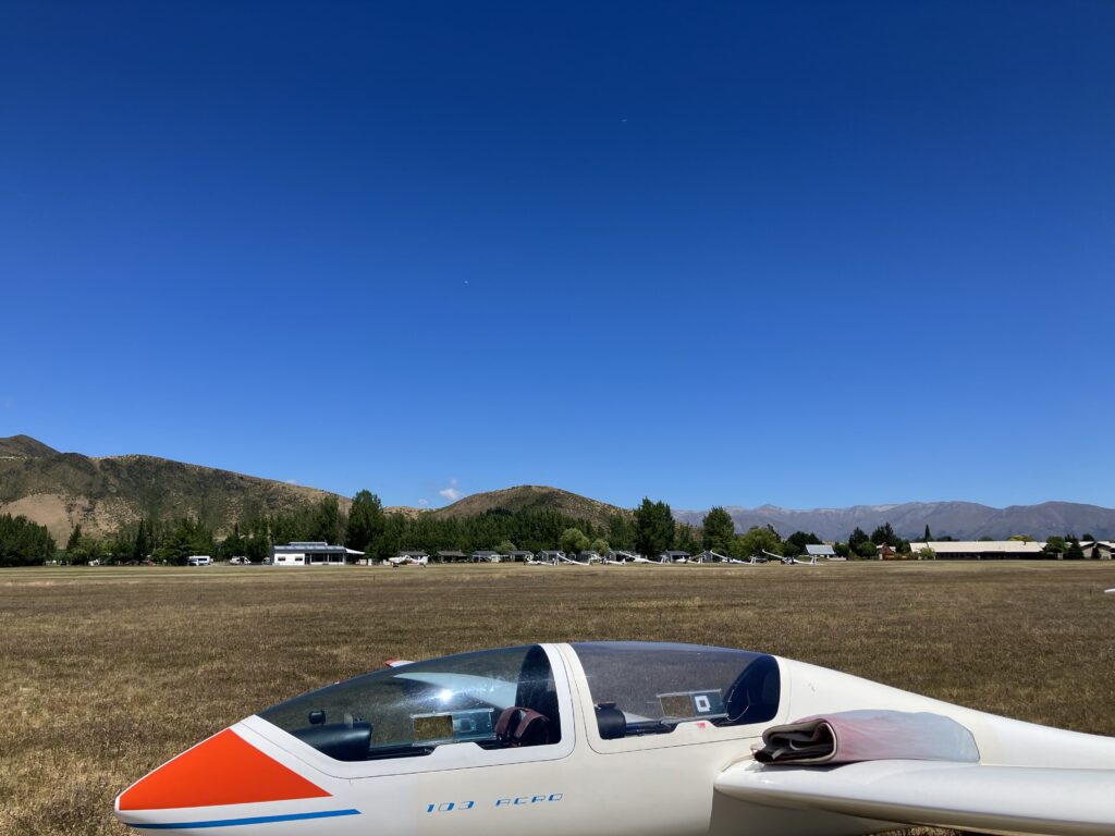 13時、私はインストラクターのジェームスとグライダーを車庫から押して出し(2人の力で動くなんて、とても軽くないですか!)車に繋げ、滑走路まで移動させます。パラシュートをまずは装着し、グライダーに乗り込みます。万が一パラシュートを使わないと行けなくなった場合の説明もしっかりと受けます。想像しただけで怖い・・・。