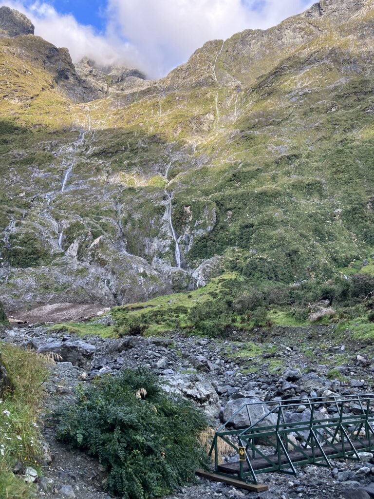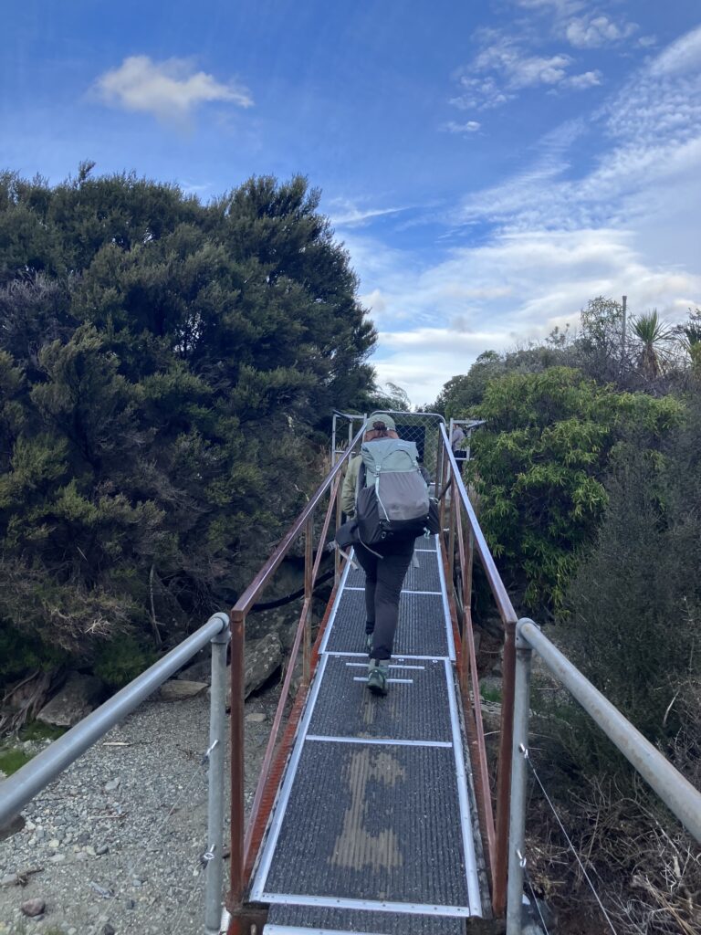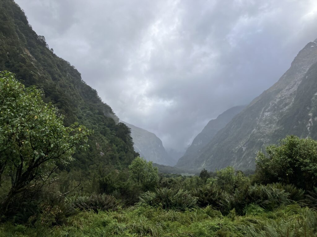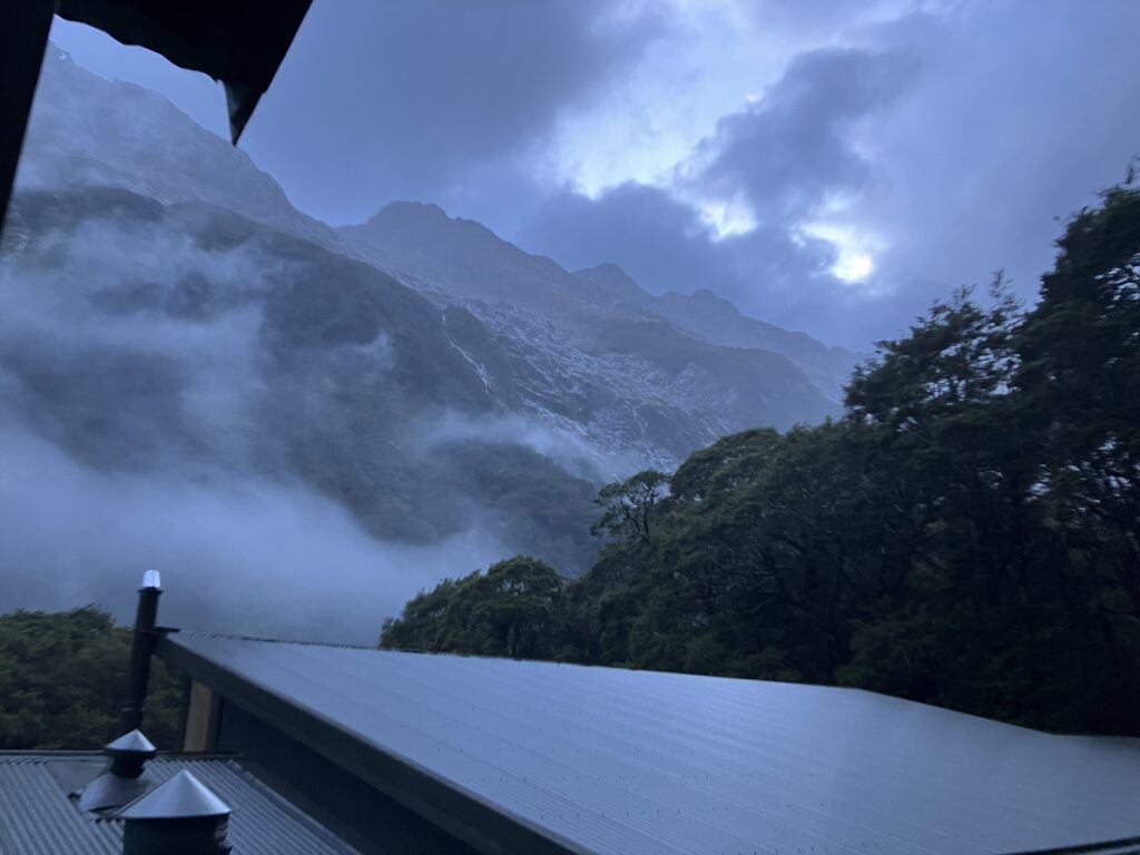Week off 4日目、私たちはP小屋を出て、16km歩きボートに乗ってテアナウに戻る日です。先は長いのでボートに乗り遅れないよう12時前には出発しようと、朝はゆっくり過ごします。お休みのケイシーと少しおしゃべりしたり、りんかちゃんのcookの仕事の様子を先輩と覗いてみたり、Mパス方向へ少しお散歩してみたり。外は、雨が止んで青空が広がります。夕方は雨予報ですが、私たちが歩く時間はレインウェアは着なくて良さそうです。