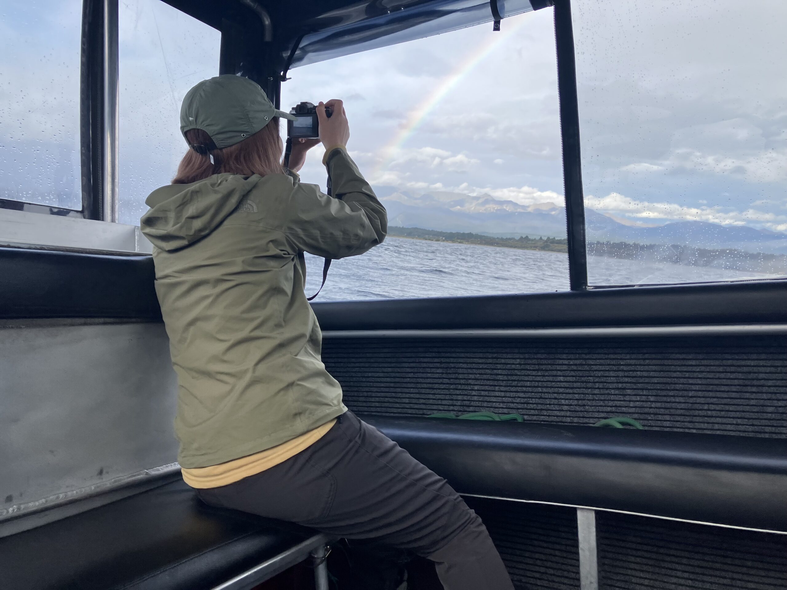 予定よりも早く、ウォータータクシーは出発し、先輩と私、それから釣り人が1人、そして運転手の4人を乗せてテアナウ・ダウンズへと向かいます。こんなに小さなウォータータクシーに乗ったのは初めてです。風が強く波の高さもあるからか、ウォータータクシーの揺れが想像の5倍ほどあります。アトラクションに乗っているような、いや、それ以上の上下運動の連続です。しかし、気持ち悪くなることはなく、景色を楽しみながら、時々私の血を吸おうとするサンドフライを潰しながら、ライドを楽しみます。